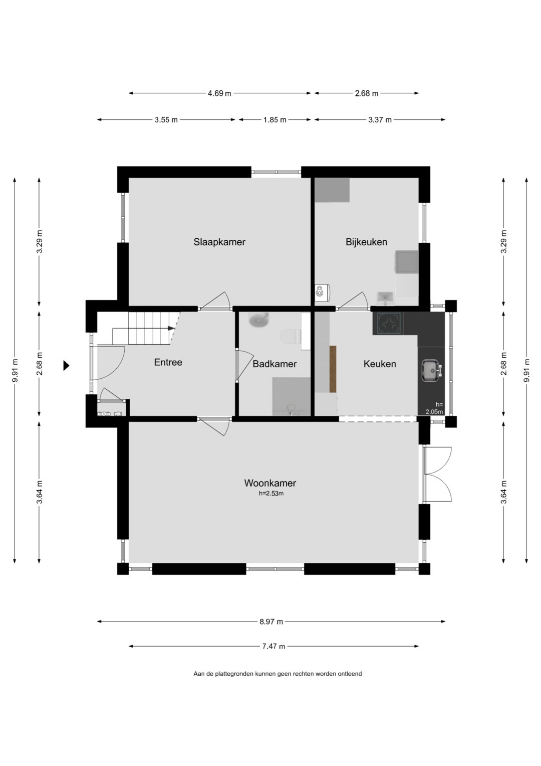 Entree, hal met meterkast en trapopgang. De ruime woonkamer is heerlijk licht met grote raampartijen en openslaande deuren naar het terras van de achtertuin. De robuuste houtkachel zorgt voor extra warmte op de koudere dagen en de airco voor koelte in de zomer. De halfopen keuken heeft een hoekkeuken en een grote wandkast, beide voorzien van inbouwapparatuur. Door de ramen boven het werkblad is er mooi zicht op de tuin en de achtergelegen weilanden. De bijkeuken met wasbakje heeft flinke afmetingen en voldoende ruimte voor witgoedaansluitingen, de cv-installatie en bergkasten. Via een tuindeur is er toegang naar de achtertuin.