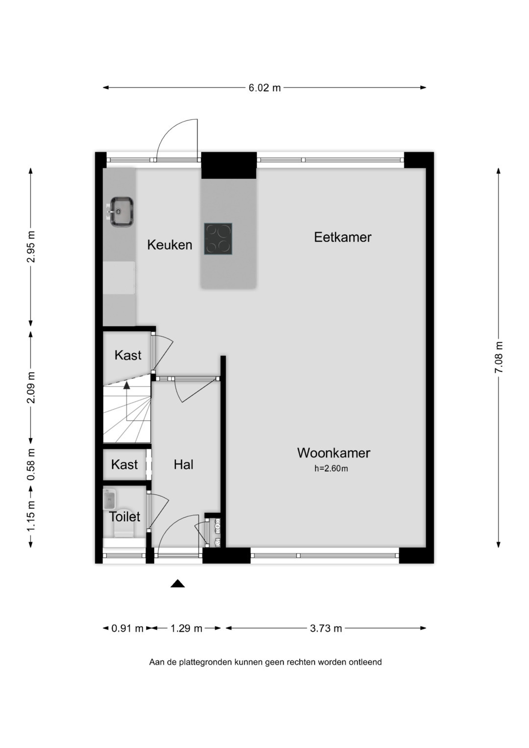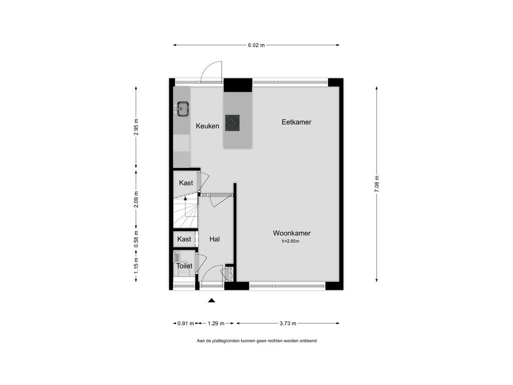 Entree, hal, meterkast, toilet, garderobe en trapopgang. Een glazen wand met deur vormt de scheiding tussen de hal en de woonkamer, wat een ruimtelijk effect geeft. De woonkamer is uitgevoerd in hedendaagse kleurstellingen en heeft veel lichtinval door de grote raampartijen. De moderne open keuken is voorzien van inbouwapparatuur en een kookschiereiland met ontbijtbar. De combinatie van donkere kastjes met een licht werkblad geeft de keuken een luxueuze strakke uitstraling. Vanuit de keuken is er toegang naar de diepe achtertuin op het zuidoosten met een stenen tuinschuur. Er is een achterom via de poort aan de achterzijde.