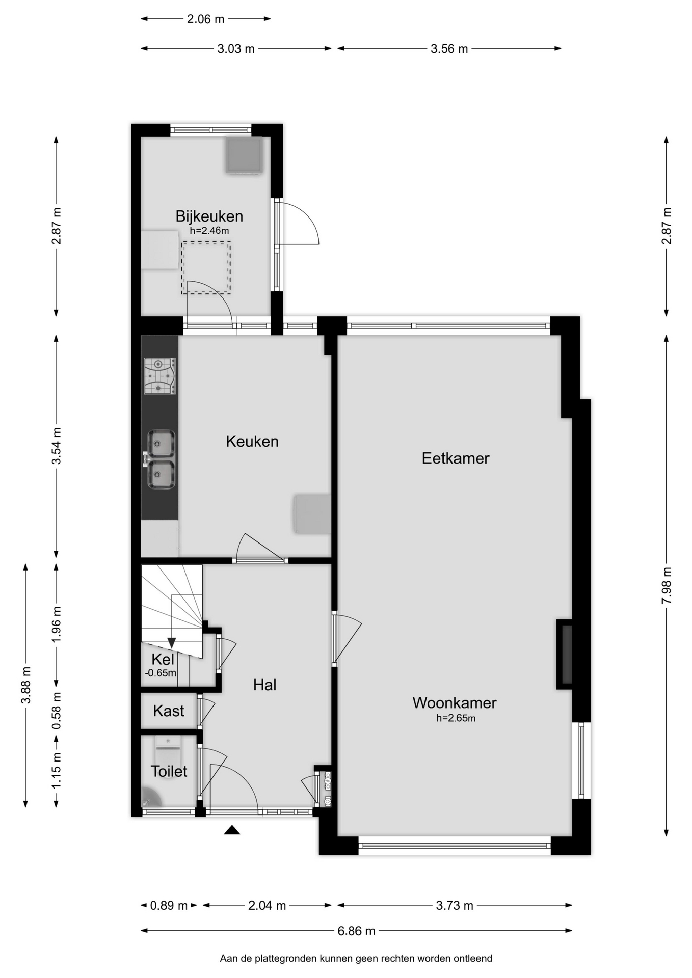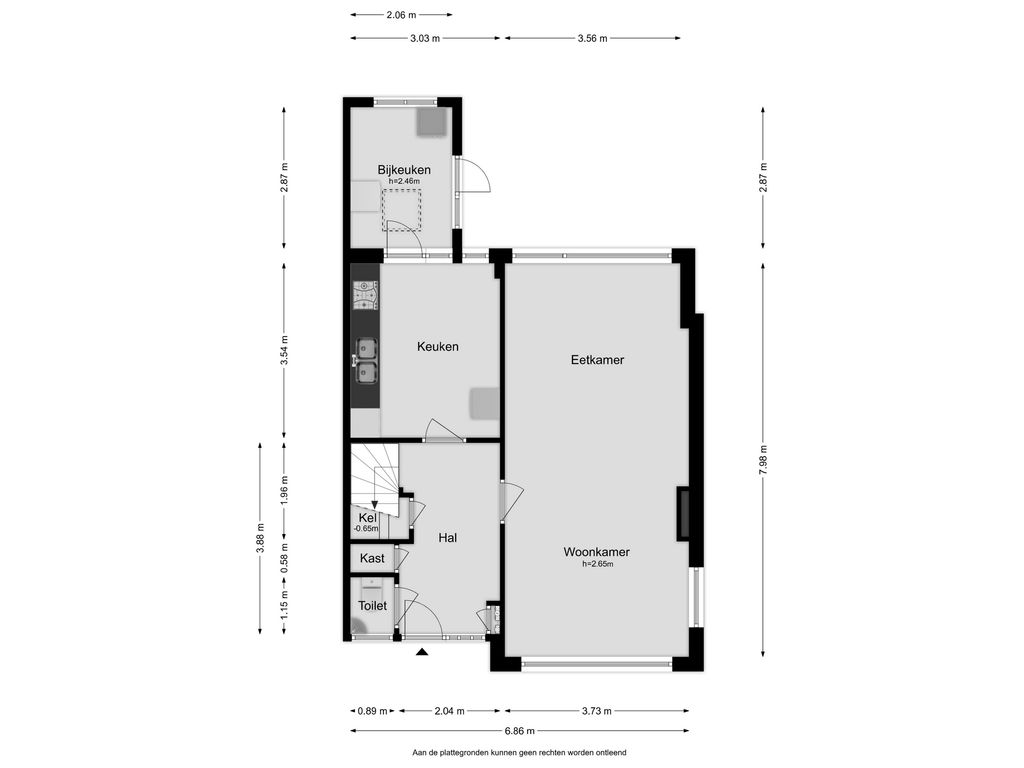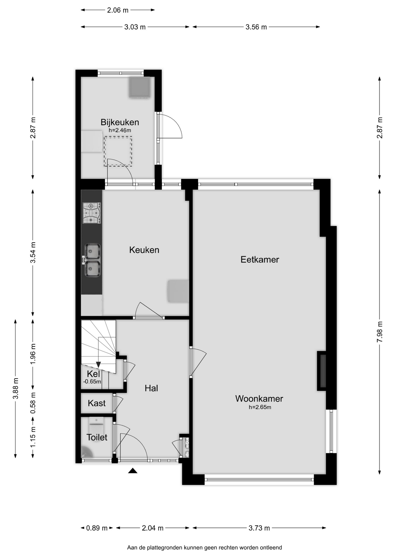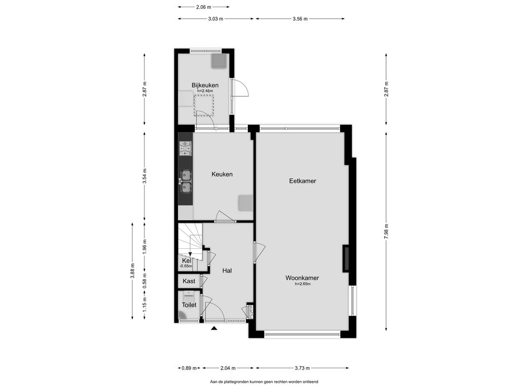 Entree, toilet, meterkast, kelderkast en de trapopgang. De woning beschikt over een ruime woonkamer met veel lichtinval door de grote raampartijen aan voor- en achterzijde. Vanuit de woonkamer is er een ruim uitzicht door de straat. De gesloten keuken heeft goed bruikbare afmetingen met een keukenblok in wandopstelling aan beide zijden. Vanuit de keuken is er toegang naar de aangebouwde bijkeuken met een toegangsdeur naar de achtertuin. De bijkeuken heeft plaats voor de witgoedaansluitingen. De beschutte achtertuin heeft een goede zonligging op het zuidwesten en is ook bereikbaar via de toegangsdeur vanaf de eigen oprit. De ruime garage heeft een lengte van 7,1 m. en is voorzien van elektra en een deur naar de achtertuin.