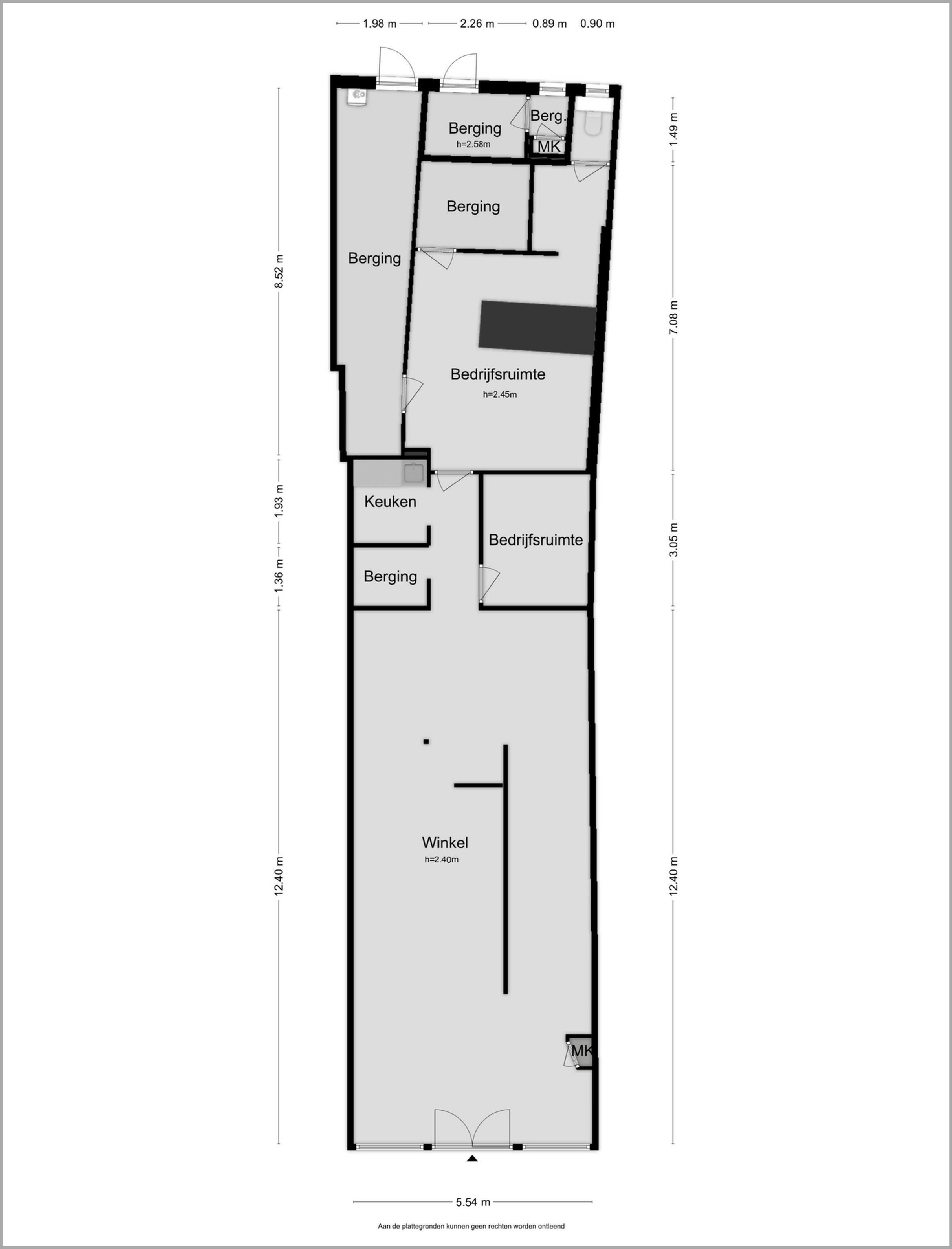 Entree (dubbele glazendeur), meterkast, winkelruimte 12,40x5,54 m. 2 kantoorruimtes, keukenblok met spoelbak. In de achtergelegen bedrijfsruimte bevindt zich een werkruimte met airconditioning, tevens zijn er een toilet en bergruimte aanwezig. Aan de achterzijde van het pand bevindt zich een een ruime achterhal met toegang naar de parkeerplaats. Tevens is hier de cv-opstelling van de winkelruimte aanwezig. Aan de achterzijde van het pand bevindt zich een aparte berging met meterkast voor de bovenwoning.