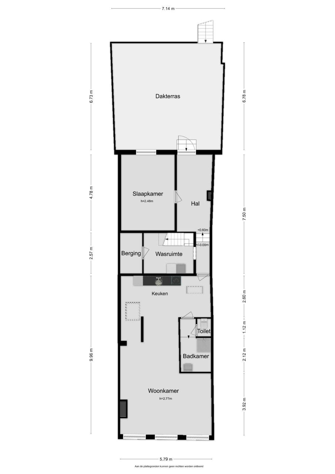 De indeling is als volgt: Hal, ruime woonkamer met veel lichtinval door de hoge ramen. Hiervandaan is er mooi zicht op de levendigheid van het centrum. De keuken heeft een wandopstelling en is voorzien van inbouwapparatuur. 2 Lichtkoepels zorgen hier voor extra daglicht. Tussen de woonkamer en keuken is een sanitaire ruimte gesitueerd met een toilet en een badkamer met douche en wastafel. Vanuit de hal is er tevens toegang naar een slaapkamer en een wasruimte. De slaapkamer heeft goede afmetingen en een raam met uitzicht op het dakterras. In de wasruimte bevinden zich de witgoedaansluitingen, een grote berging en een trap naar de 2e verdieping.