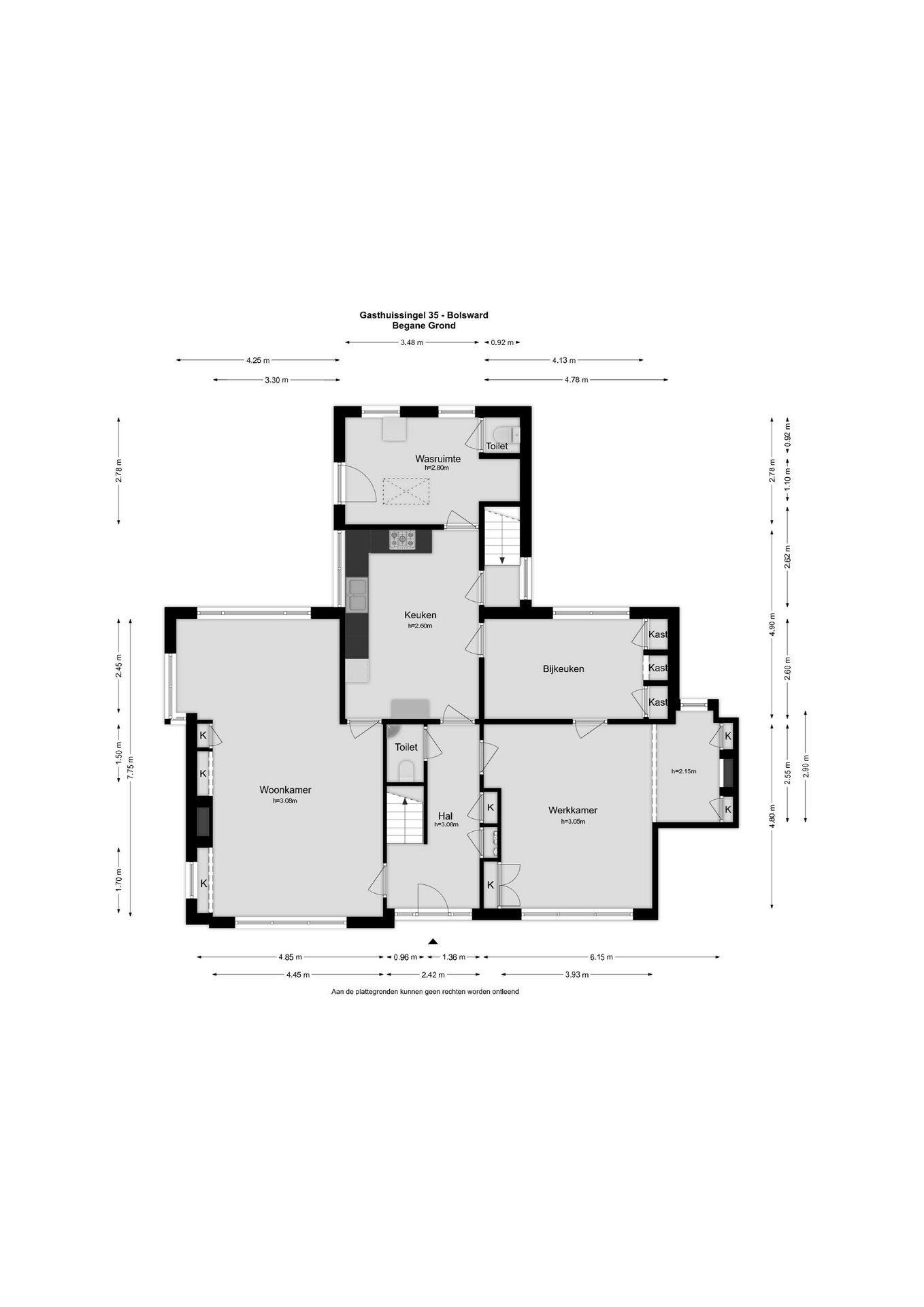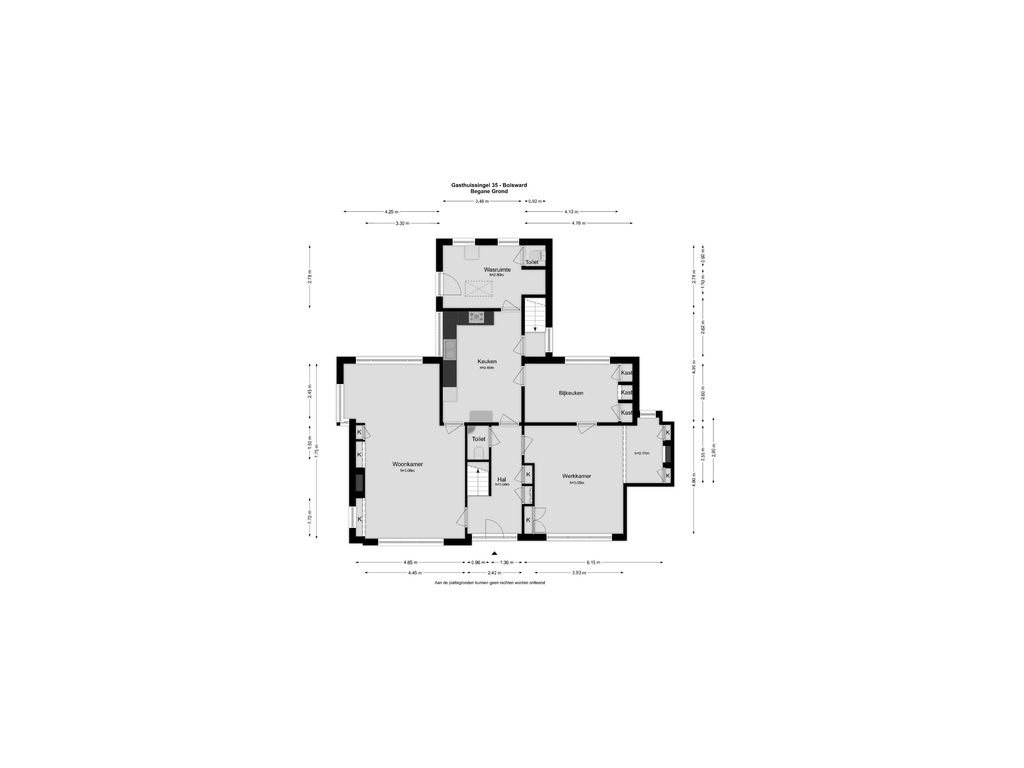 Entree, klassieke hal met schoonmetselwerk en "oude tegeltjes", meterkast, toilet en de trapopgang. De woonkamer met schouw heeft veel lichtinval door de grote ramen aan de voor- en achterzijde. Aan de andere kant van de ruime hal aan de voorzijde van de woning bevindt zich tevens een royale werkkamer of eventueel slaapkamer met inbouwkasten. Deze ruimte is ook in te richten als kantoor/praktijkruimte. De ruime woonkeuken is centraal in de woning gelegen met een keuken in hoekopstelling, voorzien van diverse inbouwapparatuur. Vanuit de keuken is er toegang tot de bijkeuken/werkkamer, de grote kelder en de wasruimte. In de wasruimte bevinden zich de aansluitingen voor het witgoed en hier is ook een 2e toilet aanwezig. Middels een vlizotrap is er toegang naar de bergzolder. De bijkeuken/werkkamer met praktische afmetingen is voorzien van een kastenwand. De ruime kelder met natuurlijke lichtinval en ventilatie biedt voldoende ruimte voor diverse hobby's of opslag.