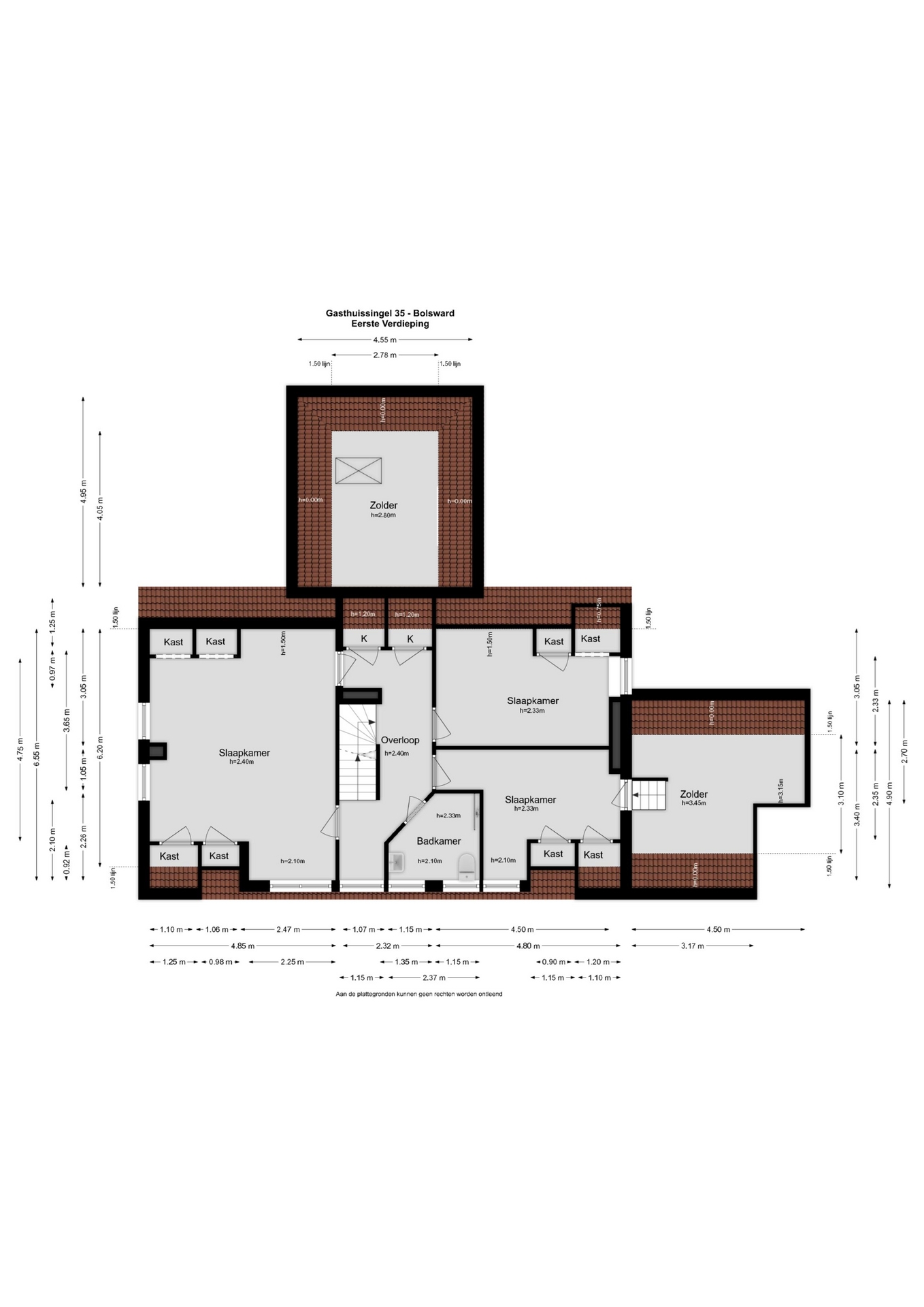 De verdieping beschikt over een centrale overloop, voorzien van 2 inbouwkasten en een trapopgang naar de 2e verdieping. De woning heeft aan de voorzijde een grote dakkapel, waardoor er veel lichtinval is in de slaapkamers en op de overloop. Vanaf de overloop is er toegang naar de 3 slaapkamers en de badkamer. De grote ouderslaapkamer aan de voorzijde van de woning heeft ramen aan 2 zijden en beschikt over flinke afmetingen. Alle 3 de slaapkamers beschikken over 2 vaste inbouwkasten. De badkamer is voorzien van een douche, wastafel en toilet.
