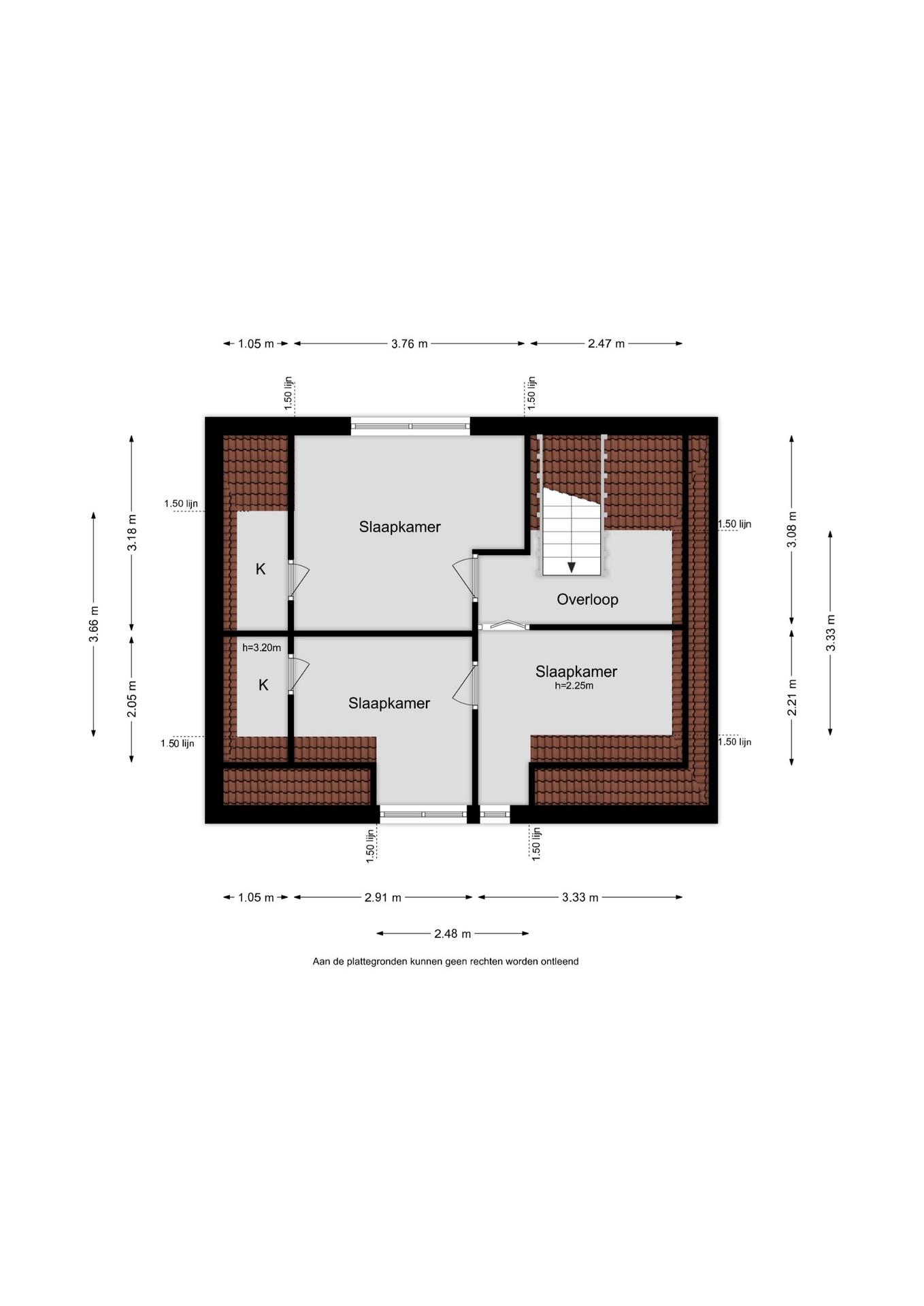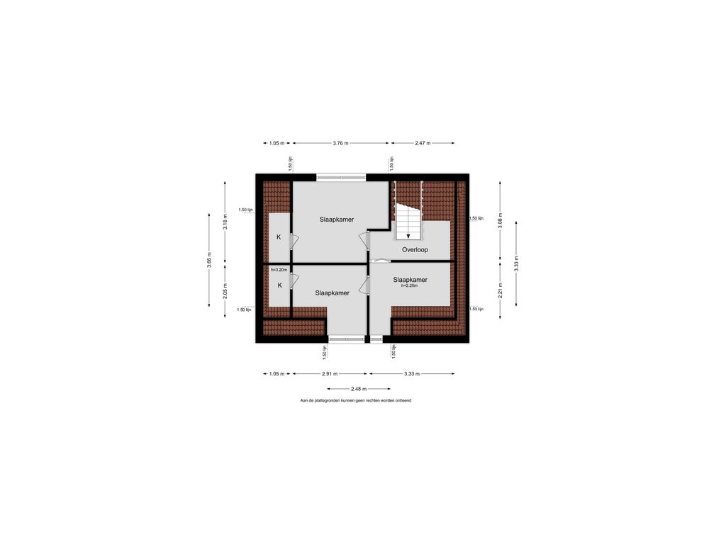 De verdieping beschikt over een centrale overloop met toegang naar de 3 slaapkamers, waarvan 2 met een vaste bergkast. De woning heeft aan zowel de voorkant als aan de achterkant een grote dakkapel.
