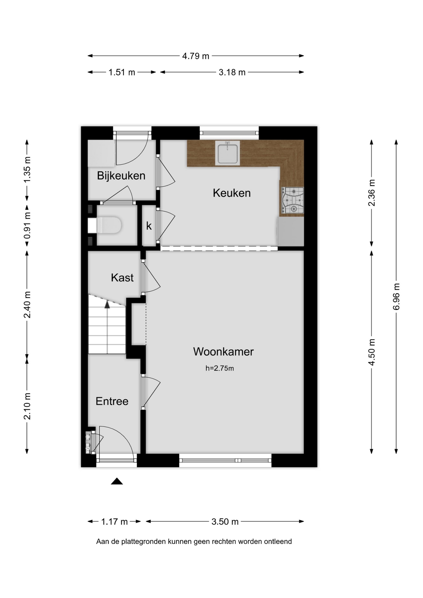 Entree, hal, trapopgang. De woning beschikt over een woonkamer met veel lichtinval en een bergkast onder de trapopgang. Er is een open hoekkeuken aan de achterzijde van de woonkamer gerealiseerd; deze is voorzien van een houten werkblad en diverse inbouwapparatuur. Tevens beschikt de woning over een bijkeuken met toiletruimte, wasmachine-aansluiting en achterdeur naar de tuin. De tuin heeft een uitstekende zonligging op het zuidwesten. In de vrijstaande stenen bergschuur is voldoende bergruimte voor fietsen en tuinspullen. De auto kan op de oprit naast de woning worden geparkeerd.