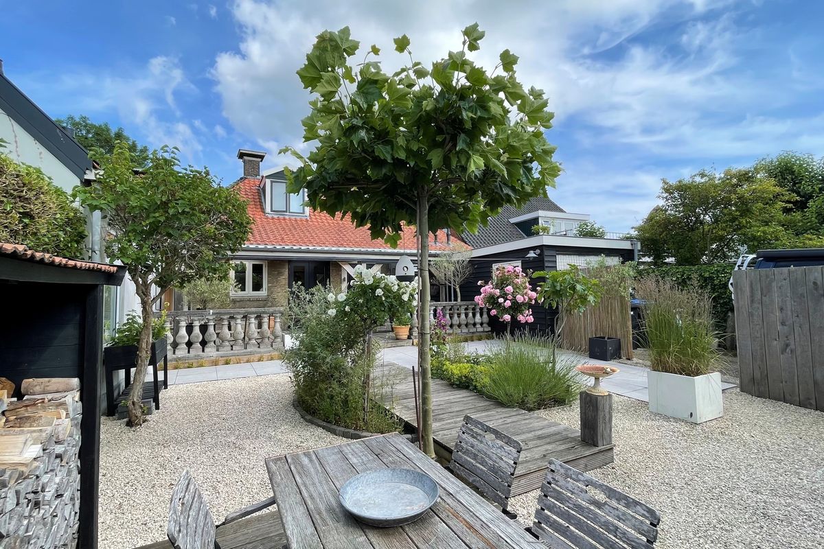 De achtertuin op het noordwesten is onderhoudsvriendelijk aangelegd met strakke lijnen en diverse terrassen. De verschillende verhardingen en de gekozen beplanting zorgen voor een romantische uitstraling. Vanaf het terras onder de overkapping heeft u een prachtig zicht op de gehele tuin. De veranda heeft een verplaatsbare glazen afscheiding, waardoor het hier ook bij kouder weer heerlijk beschut is. Vanaf de oprit is er een achterom naar het achtergelegen toegangsweg en speelveldje.