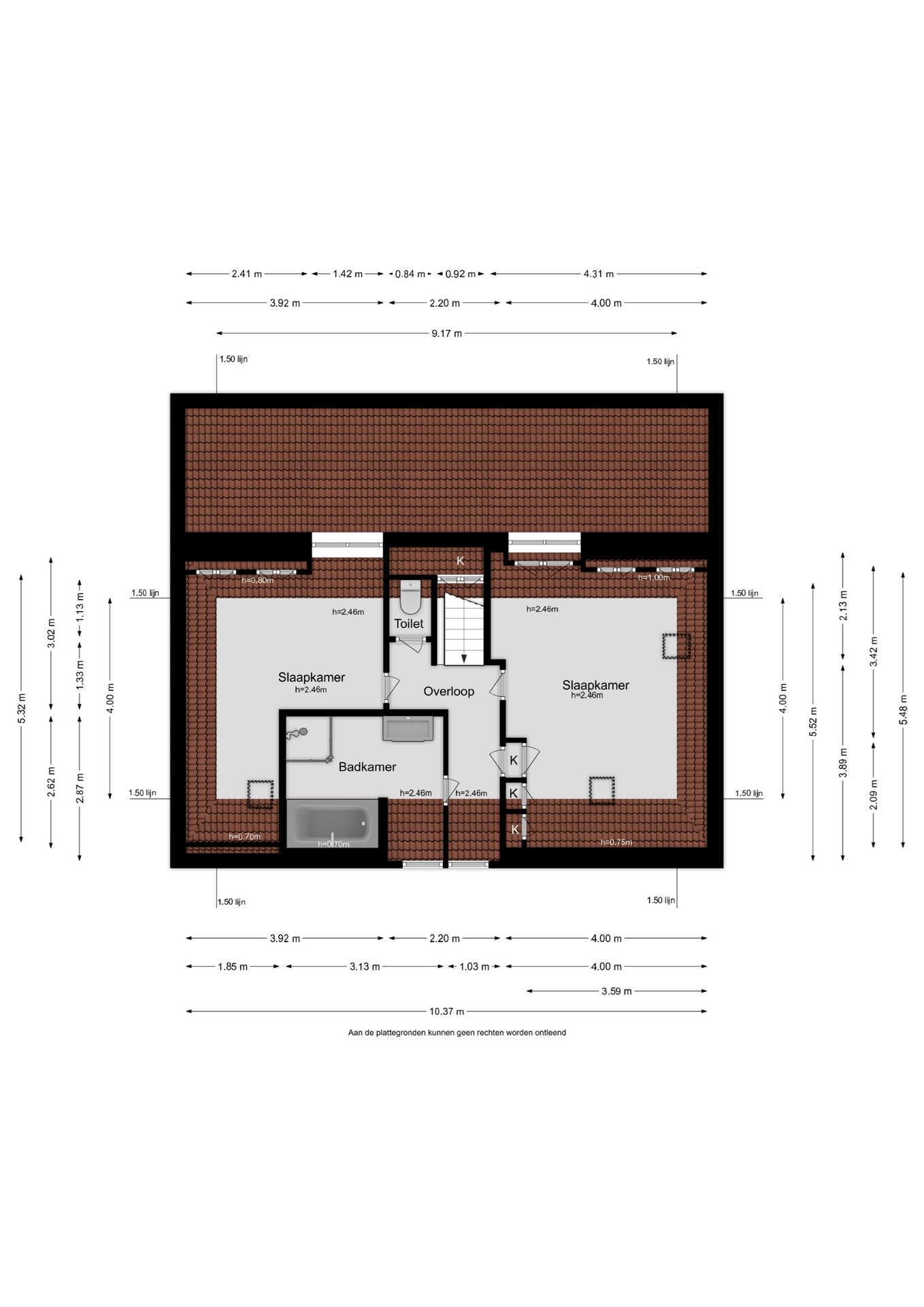 Op de verdieping zijn 3 dakkapellen, 1 aan de voorzijde en 2 aan de achterzijde, deze zorgen voor extra ruimte op de verdieping. De 2 slaapkamers bevinden zich aan weerszijden van de centrale overloop. In deze kamers zijn de balken in het zicht gehouden en wordt de hoogte maximaal benut. De badkamer is voorzien van een ligbad, een douchecabine en een wastafelmeubel. Op de overloop bevindt zich tevens een separaat toilet. De vloer en douchewanden van de badkamer zijn betegeld met Laperto tegels, evenals de vloer van het toilet.