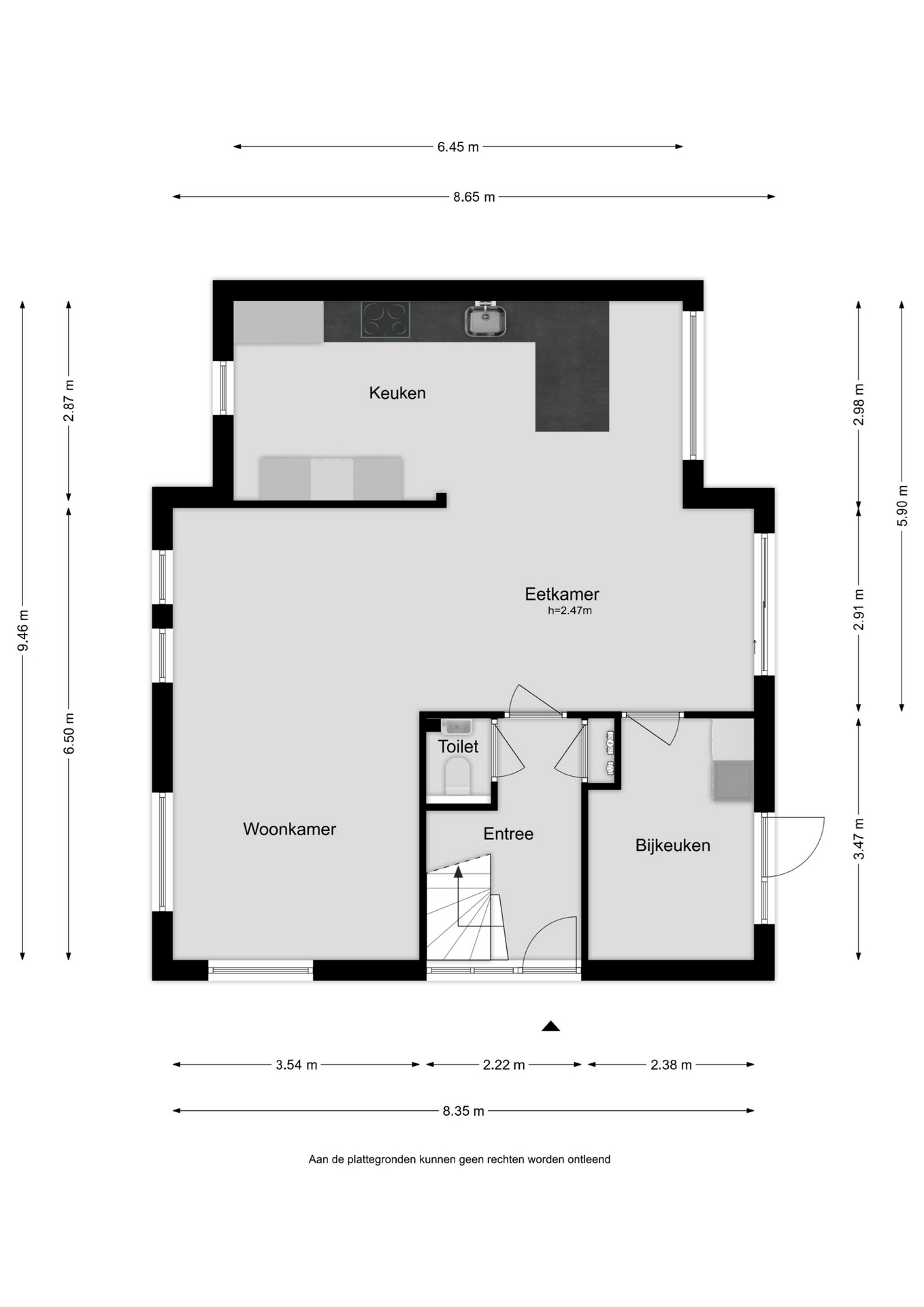 Entree, hal, meterkast, trapopgang, toilet. De ruime L-vormige woonkamer heeft veel lichtinval. Het zitgedeelte aan de voorzijde biedt een mooi zicht de straat in. De woonkamer is aan de achterzijde uitgebouwd, waardoor een groter eetgedeelte is ontstaan en een ruime keuken. De grote schuifpui geeft direct doorgang naar het terras in de achtertuin. De luxe antracietkleurige keuken bestaat uit een ruime kastenwand, een lang werkblad met bergruimte en een ontbijtbar. De keuken is voorzien van inbouwappartuur. In de bijkeuken bevinden zich de witgoedaansluitingen, de cv-opstelling en een achterdeur naar de tuin. De ruime garage/berging is voorzien van openslaande garagedeuren, elektra en water. De vide aan beide zijden zorgen voor extra bergruimte. De achtertuin is mooi verzorgd en beschikt over een terras met overkapping.