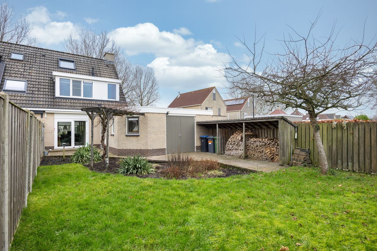 De voortuin op het noordoosten bestaat uit een border met vaste beplanting, grind met stapstenen voor de ramen en een ruime oprit aan de zijkant. De achtertuin heeft een fijne zonligging op het zuidwesten. Deze tuin is prima verzorgd en aangelegd met sierbestrating, een gazon, borders en een pergola, houtopslag en opstelplaats voor de containers.