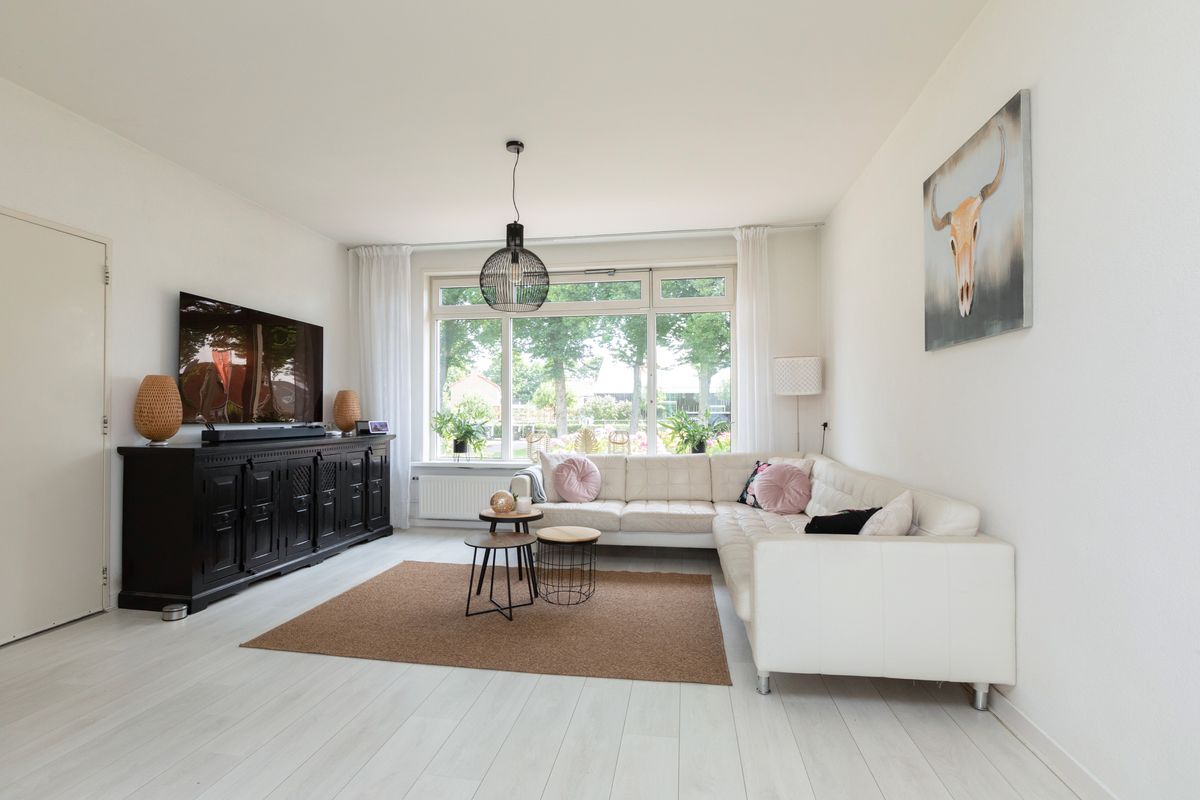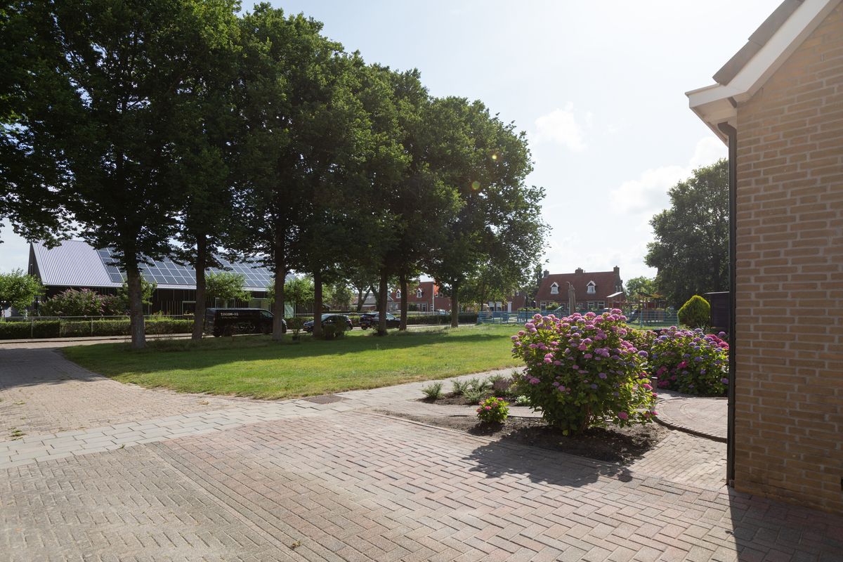 De voortuin is op het noordoosten gelegen en voorzien van sierbestrating en borders. De grote groenstrook voor de woning geeft een ruimtelijk gevoel.