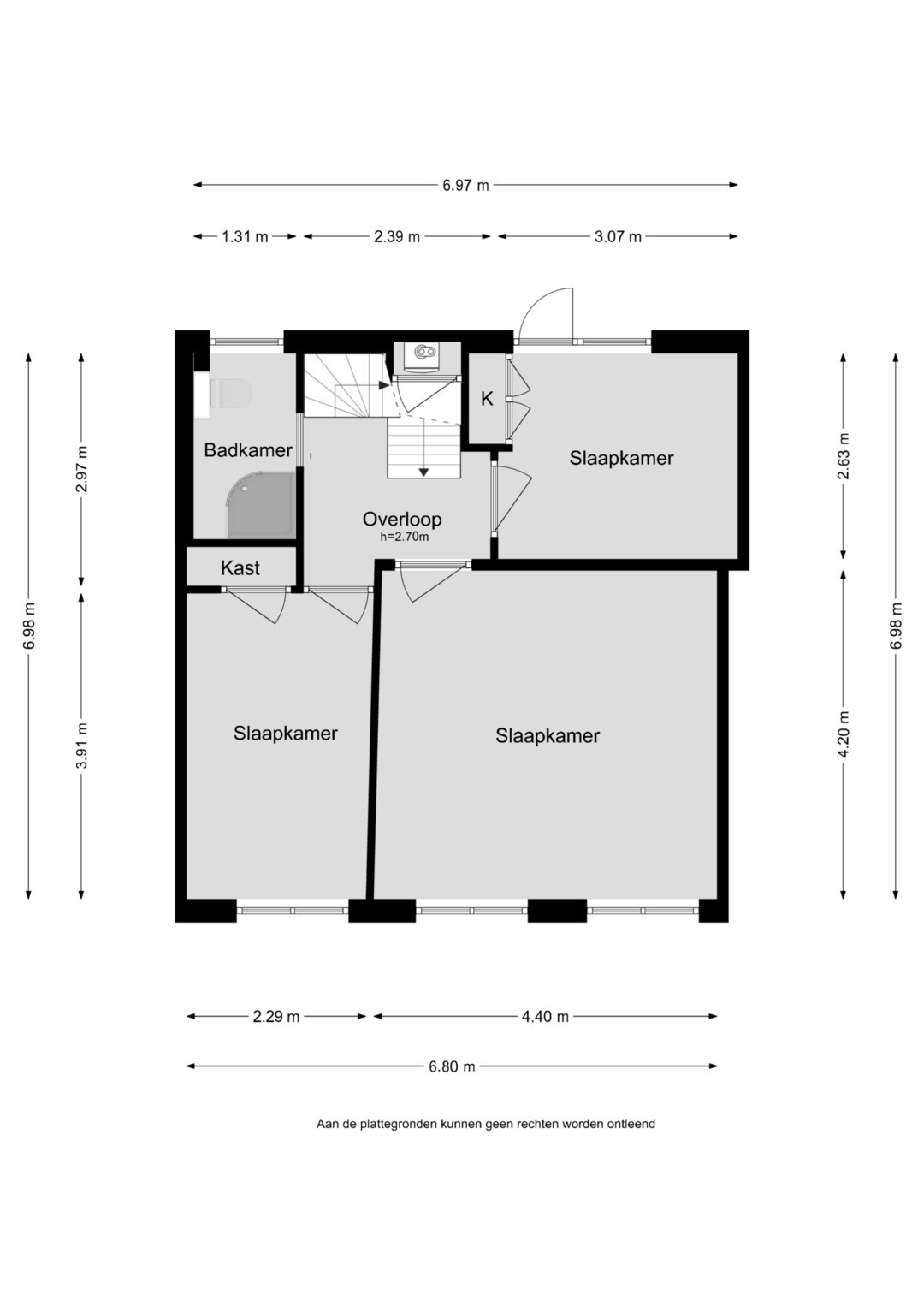 De 1e verdieping beschikt over een centrale overloop, 3 royale slaapkamers en een badkamer. De 2 kleinere kamers hebben vaste bergkasten en de kamer aan de achterzijde heeft tevens een deur naar het platdak. De badkamer is voorzien van een douche, 2e toilet en een wastafelmeubel.