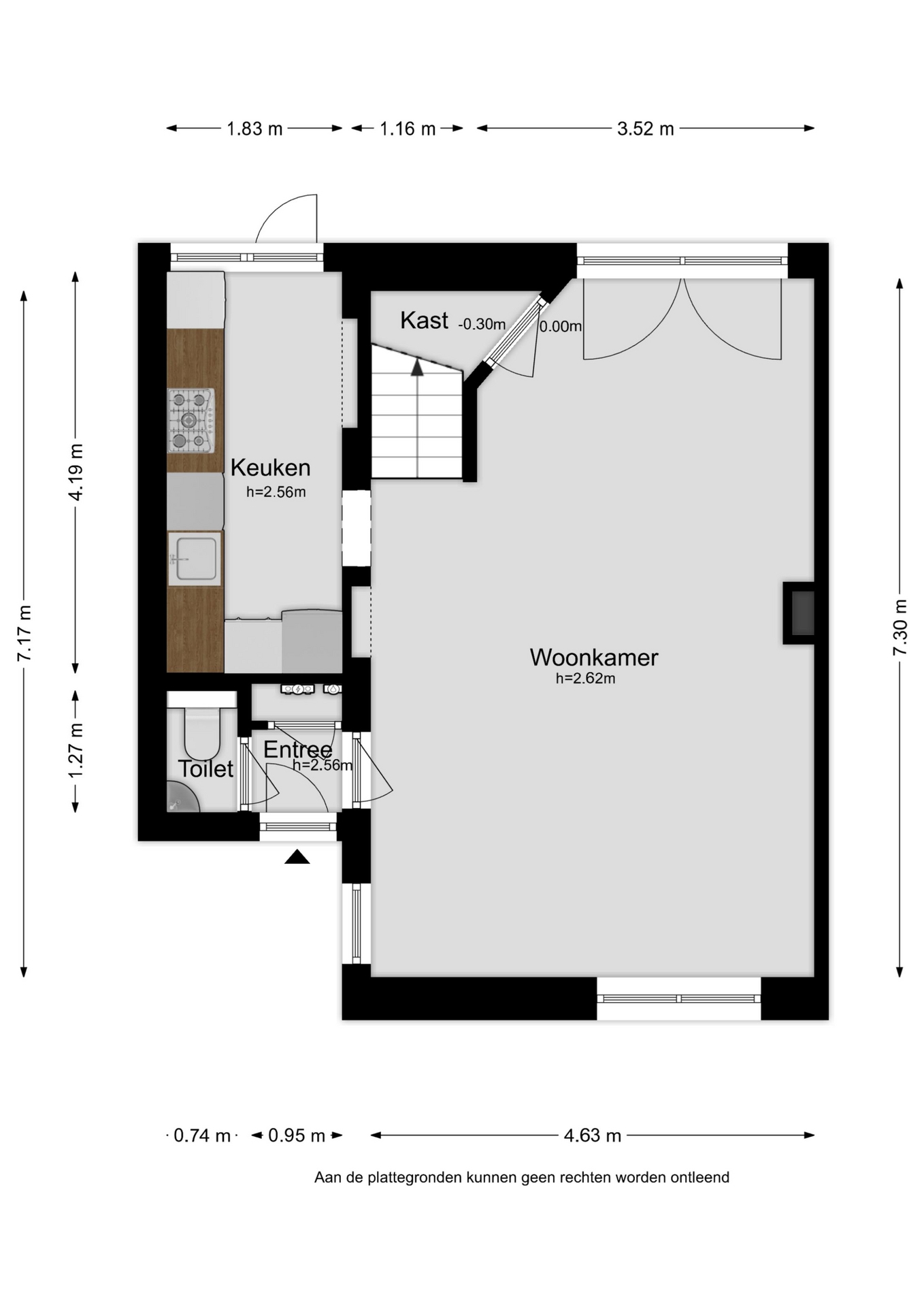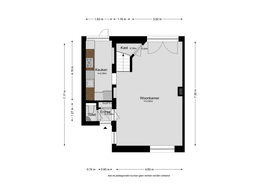 Entree, meterkast en toilet. De ruime woonkamer is uitgevoerd in lichte kleurstellingen. Ramen aan de voor- en zijkant en openslaande deuren naar de tuin zorgen voor veel lichtinval. Onder de trap bevindt zich een praktische vaste kast. Een open doorgang leidt naar de lichte keuken. Deze keuken is voorzien van een wandopstelling met inbouwapparatuur en een deur naar de tuin. De beschutte achtertuin heeft een goede zonnestand en een vrij achterom via de zijkant van de woning. De tuin is onderhoudsvriendelijk en voorzien van een stenen bergschuur.