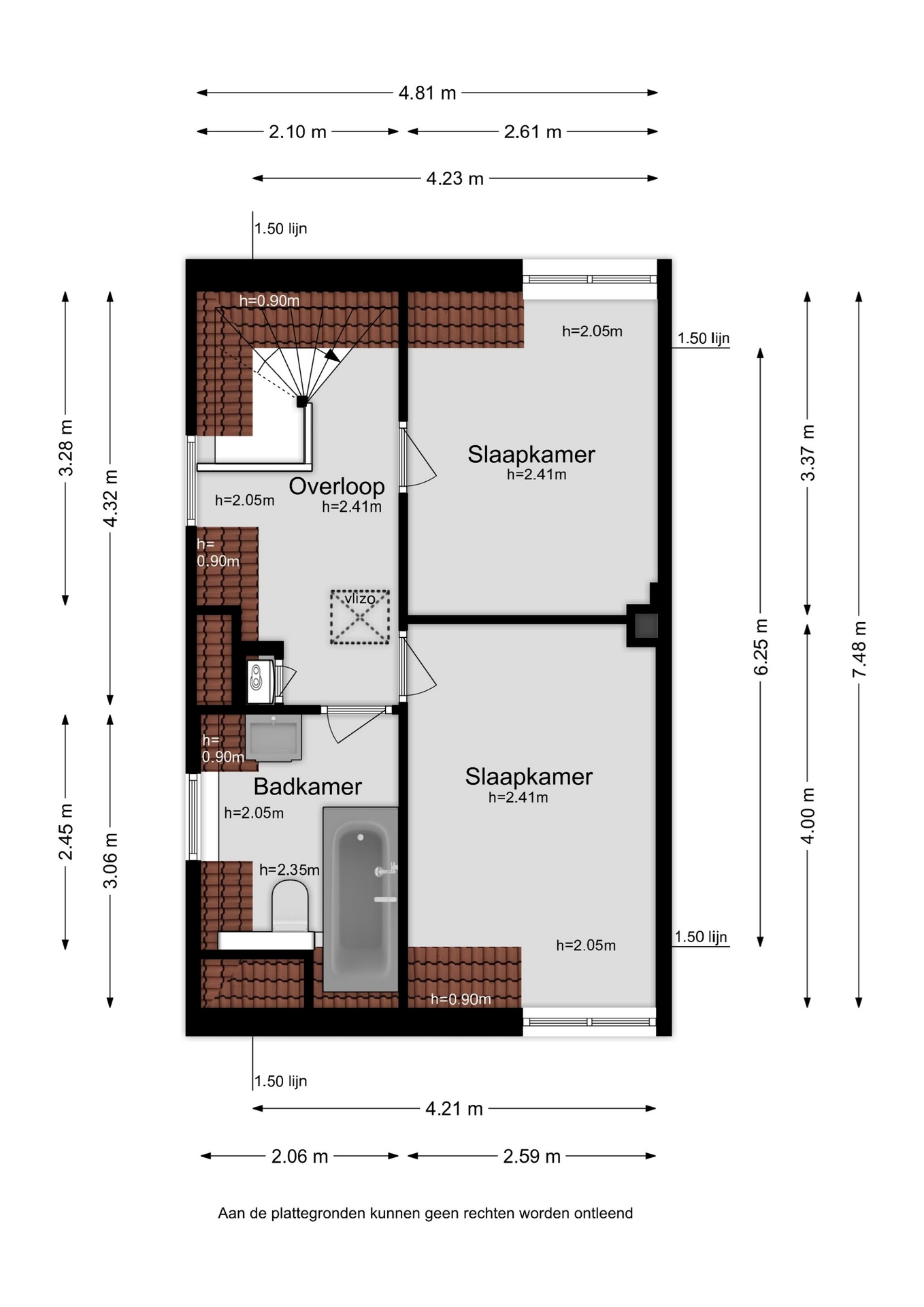 De overloop heeft ruime afmetingen en biedt voldoende ruimte voor een werkplek. Hier bevindt zich tevens een kast met de cv-intallatie. Vanaf de overloop is er toegang naar de 2 slaapkamers en de badkamer. Beide slaapkamers hebben extra ruimte door een dakkapel. Ook de badkamer heeft een dakkapel en is voorzien van een ligbad, toilet en een wastafelmeubel. De woning heeft een ruime bergzolder, deze is bereikbaar vanaf de overloop middels een losse trap.