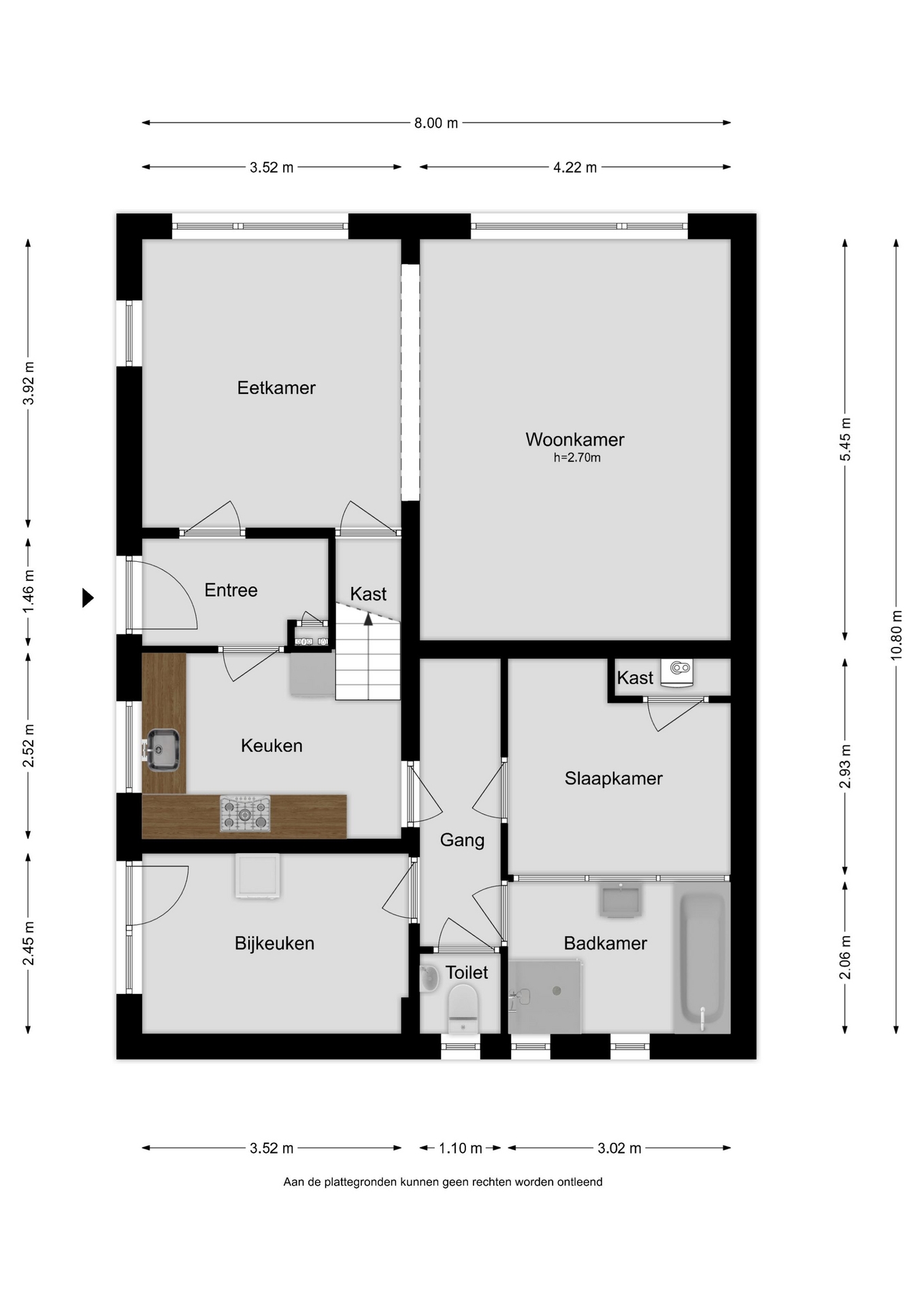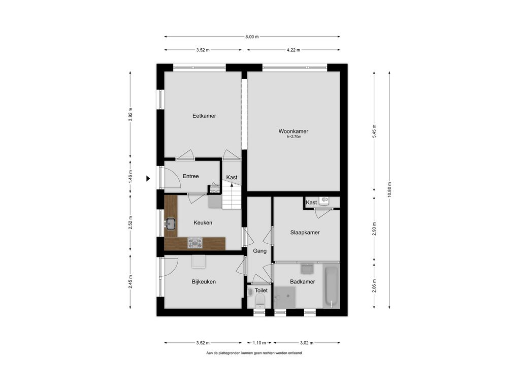 Hal, entree, meterkast en toegangsdeuren naar de woonkamer en naar de keuken. De ruime woonkamer heeft een mooi balkenplafond en de grote ramen zorgen voor veel lichtinval. De gesloten keuken aan de andere kant van de hal heeft flinke afmetingen en hier bevindt zich tevens de trapopgang. De royale hoekkeuken is voorzien van inbouwapparatuur en een handig fornuis. Rond de naastgelegen gang zijn de overige ruimtes op de begane grond gesitueerd: toilet, slaapkamer, badkamer en bijkeuken. De slaapkamer krijgt lichtinval via de bovenramen naar de badkamer. De cv-installatie bevindt zich hier in een afsluitbare kast. De badkamer beschikt over een ligbad, een doucheruimte en een wastafelmeubel. De bijkeuken biedt voldoende ruimte voor de witgoedaansluitingen en heeft tevens een deur naar de tuin. De beschutte tuin is aangelegd met terrassen, gazon en een houten bergschuur.