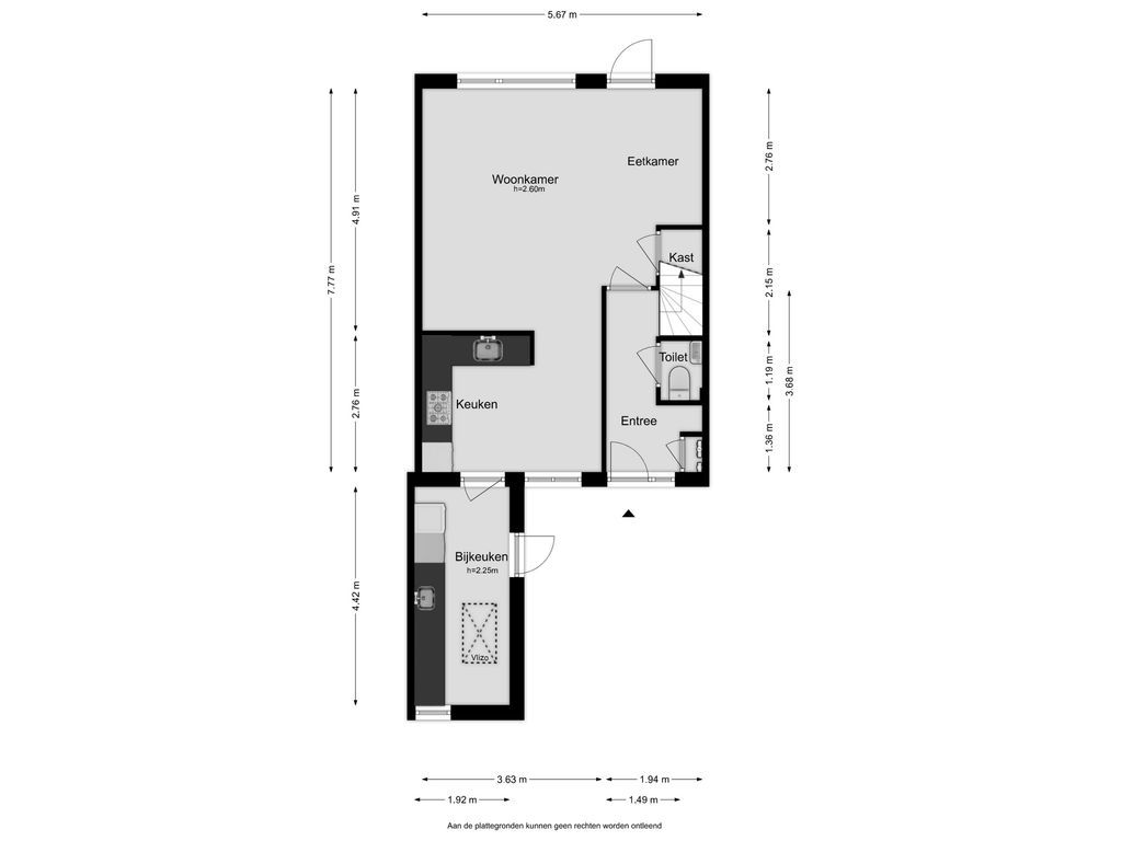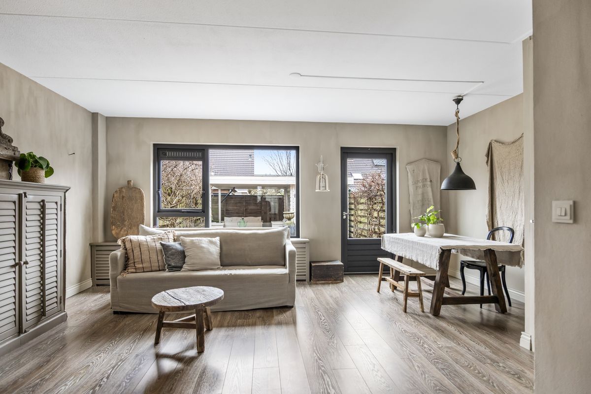 De ruime woonkamer is aan de achterzijde gesitueerd met toegang naar de achtertuin. Deze tuingerichte woonkamer is strak afgewerkt en uitgevoerd in rustgevende aardetinten. De diepe trapkast zorgt voor extra bergruimte. De moderne hoekkeuken is aan de voorzijde geplaatst en beschikt over diverse inbouwapparatuur. De bijkeuken is bereikbaar vanuit de keuken. De bijkeuken heeft praktische afmetingen en biedt voldoende ruimte voor de plaatsing van witgoedapparatuur. Middels een vlizotrap is de bergzolder bereikbaar. De achtertuin is heerlijk beschut en heeft een zonligging op het zuidoosten. De tuin beschikt over een houten bergschuur met veranda en heeft een achterom via de achterliggende steeg.