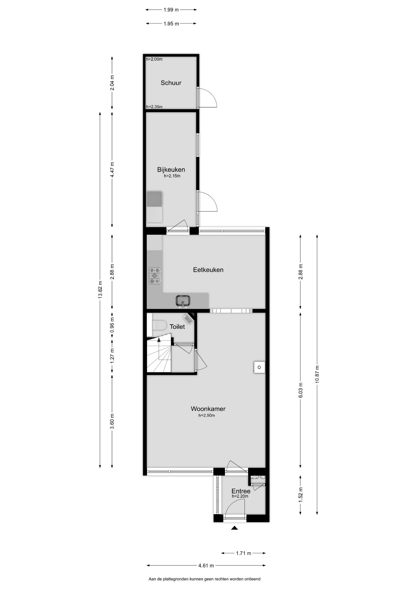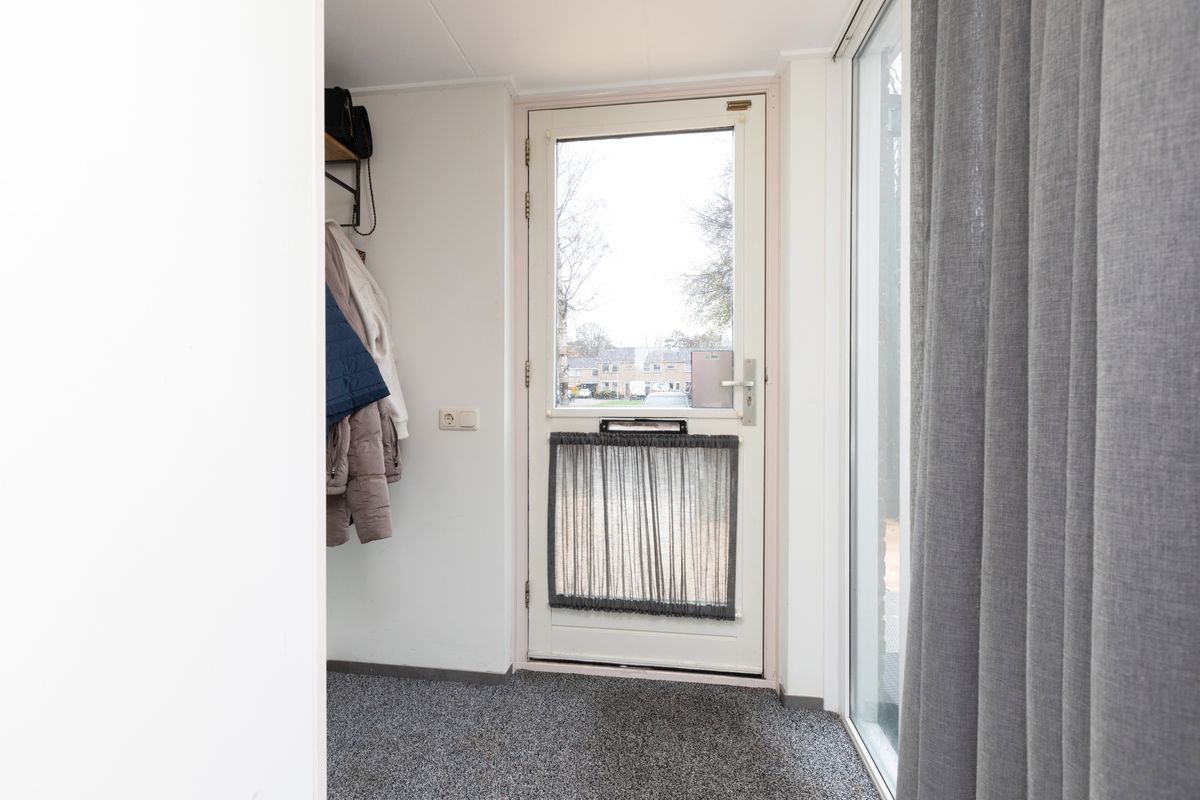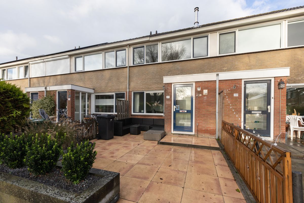 Entree, hal en meterkast. De ruime woonkamer beschikt over een rookkanaal en heeft veel lichtinval door de grote ramen. Tussen de woonkamer en de keuken bevindt zich een tussenhal, hier bevinden zich het toilet en de trapopgang naar de eerste verdieping. De open keuken is voorzien van een modern keukenblok in hoekopstelling en is voorzien van diverse inbouwapparatuur. Vanuit de keuken is er toegang tot de bijkeuken met witgoedaansluitingen en een deur naar de tuin. De beschutte achtertuin is betegeld en voorzien van een bergschuur. Er is een eigen achterom via de achtergelegen steeg. De ligging is op het noordwesten.